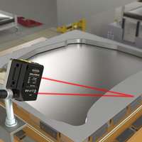邦纳LE550激光传感器是零部件就位检验过程的理想选择。对于远距离外的小型零部件就位检验,它既可靠又非常准确。LE550采用数字输出来测量3 mm的厚度,确保固定夹存在,并且发动机缸体处于正确位置。